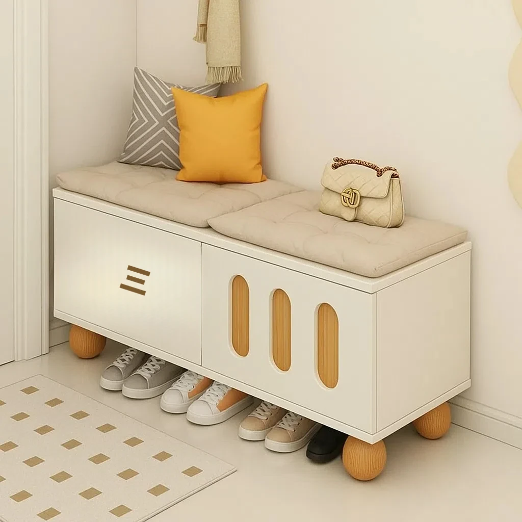 クリーミーな風合いの玄関用スツール収納ベンチ - 座るも収納するもこれ一台!おしゃれで機能的なシューキャビネット、長椅子型でスムーズな靴の着脱を実現。お家の玄関を素敵に演出!