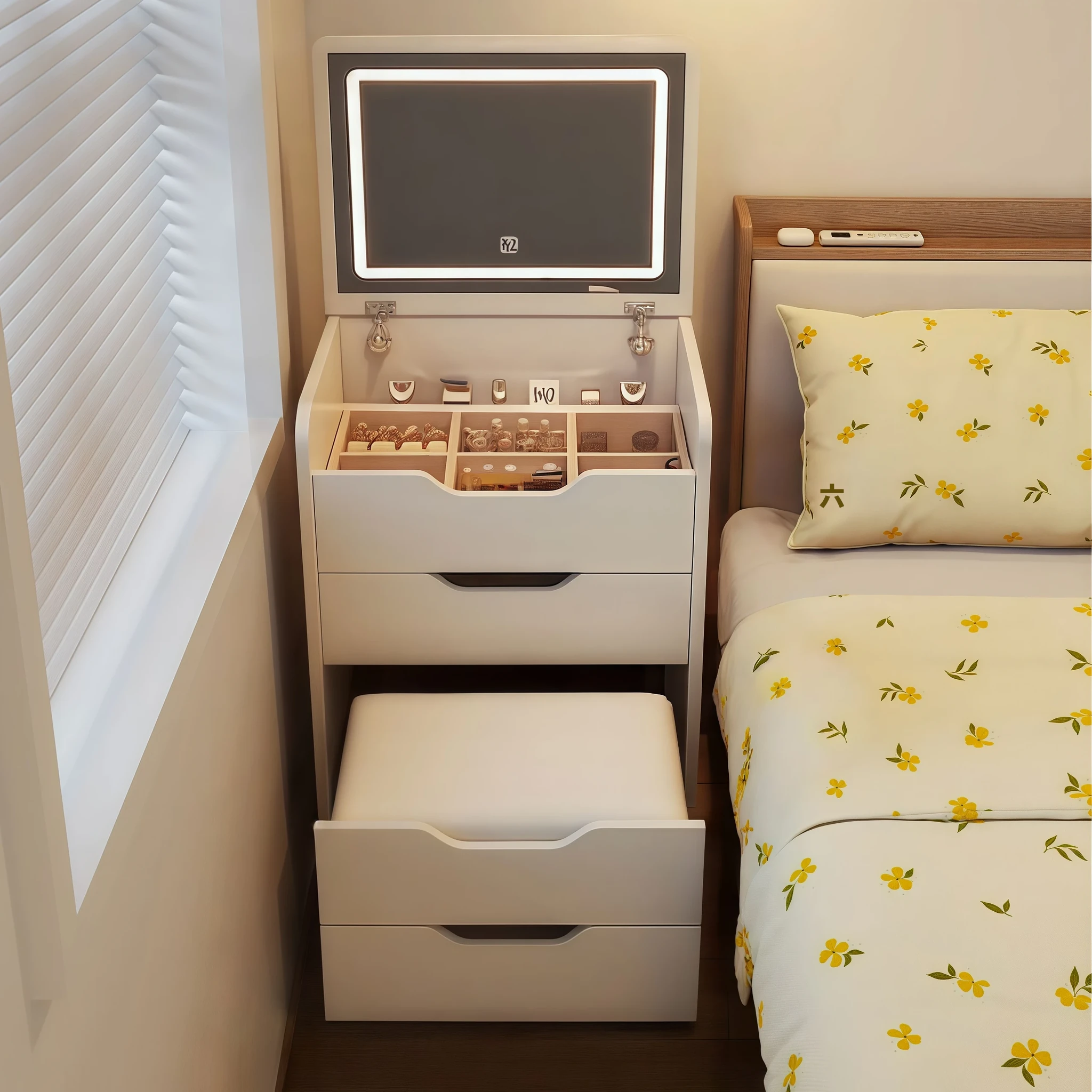 2025年新作!レトロな化粧台と収納キャビネットが一体化した、モダンでシンプルなデザインの小型ベッドサイドテーブル。スタイリッシュな鏡付きで、お部屋をおしゃれに演出します!
