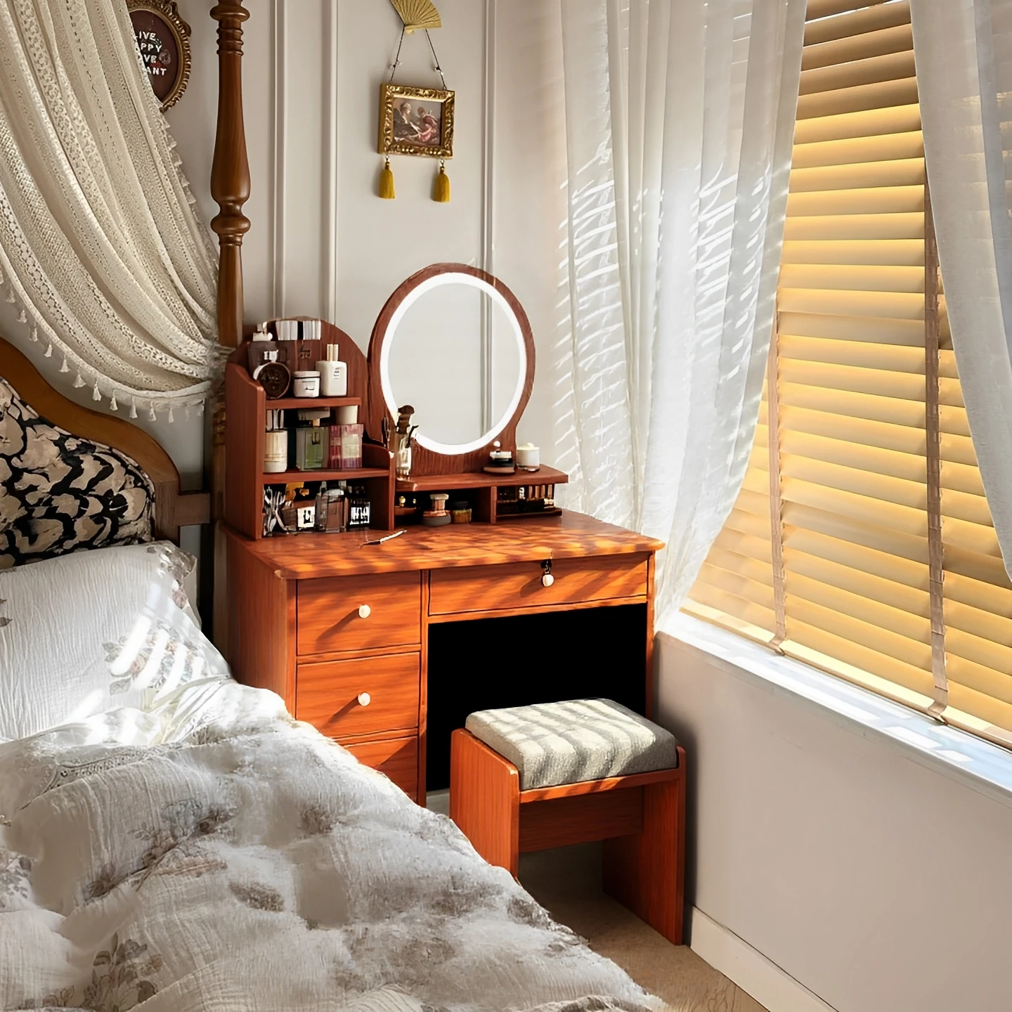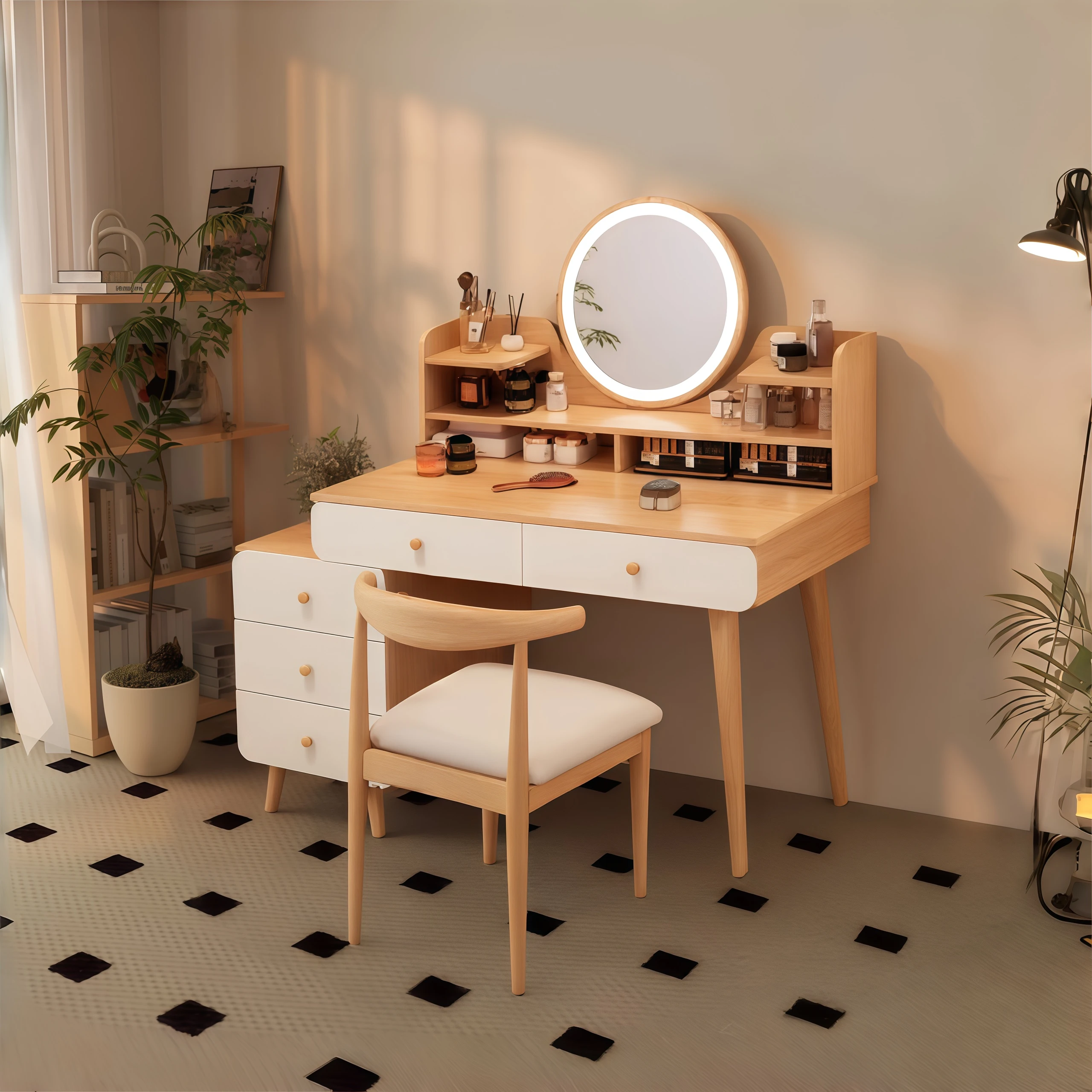 新作!2025年版 原木風スタイリッシュドレッシングテーブル 小型収納一体型 コーナーにぴったりのシンプルデザイン 主寝室用ミラー付きデスク メイクアップデスク