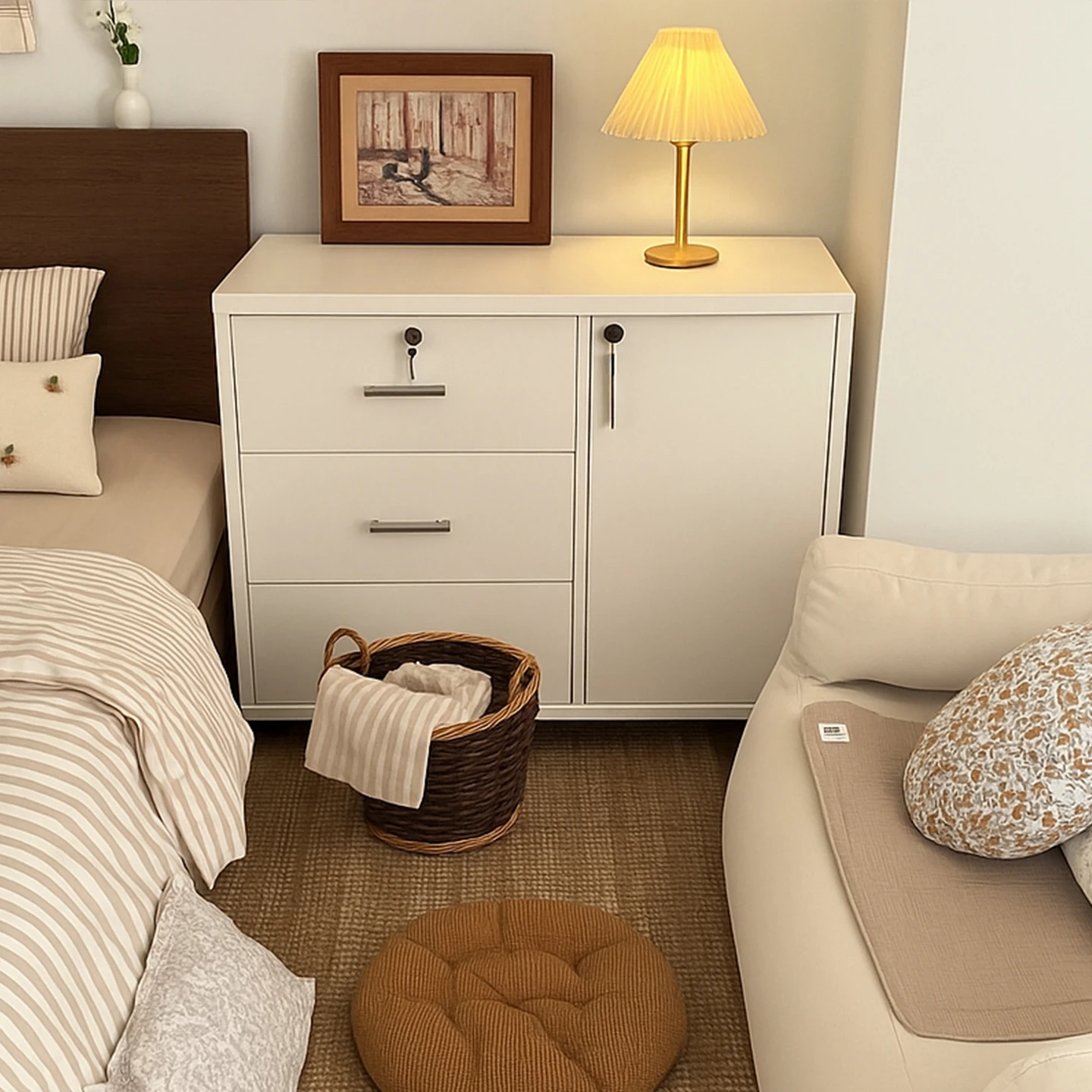 Cream-Colored Lockable Nightstand - Compact Storage Cabinet for Home, Mobile Bedside Organizer, Perfect for Keeping Your Essentials Secure and Stylish!