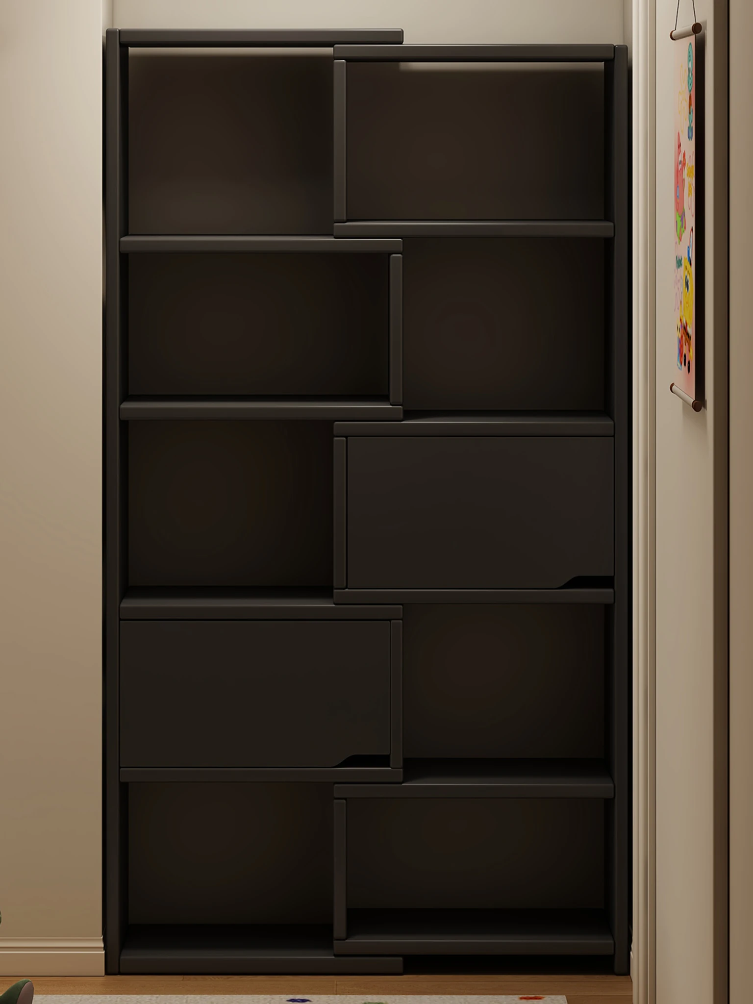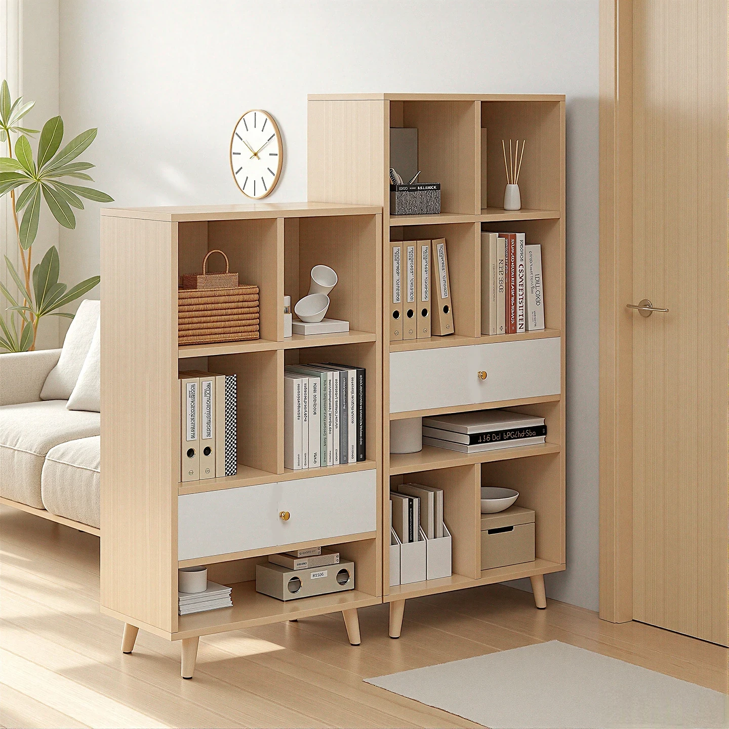 Japanese Style Wooden Bookshelf - Wall-Mounted Display Cabinet for Home, Bedroom Storage Unit with Drawer for Organized Book Storage