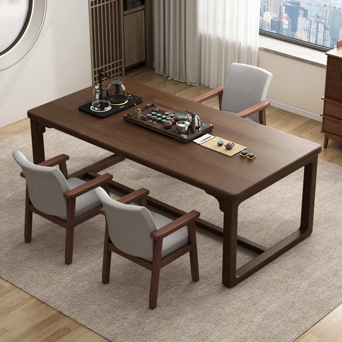 Walnut Color Balcony Tea Table Set - Modern Chinese Style Large Tea Table for Home, Perfect for Tea Brewing with Chairs for Your Tea Room