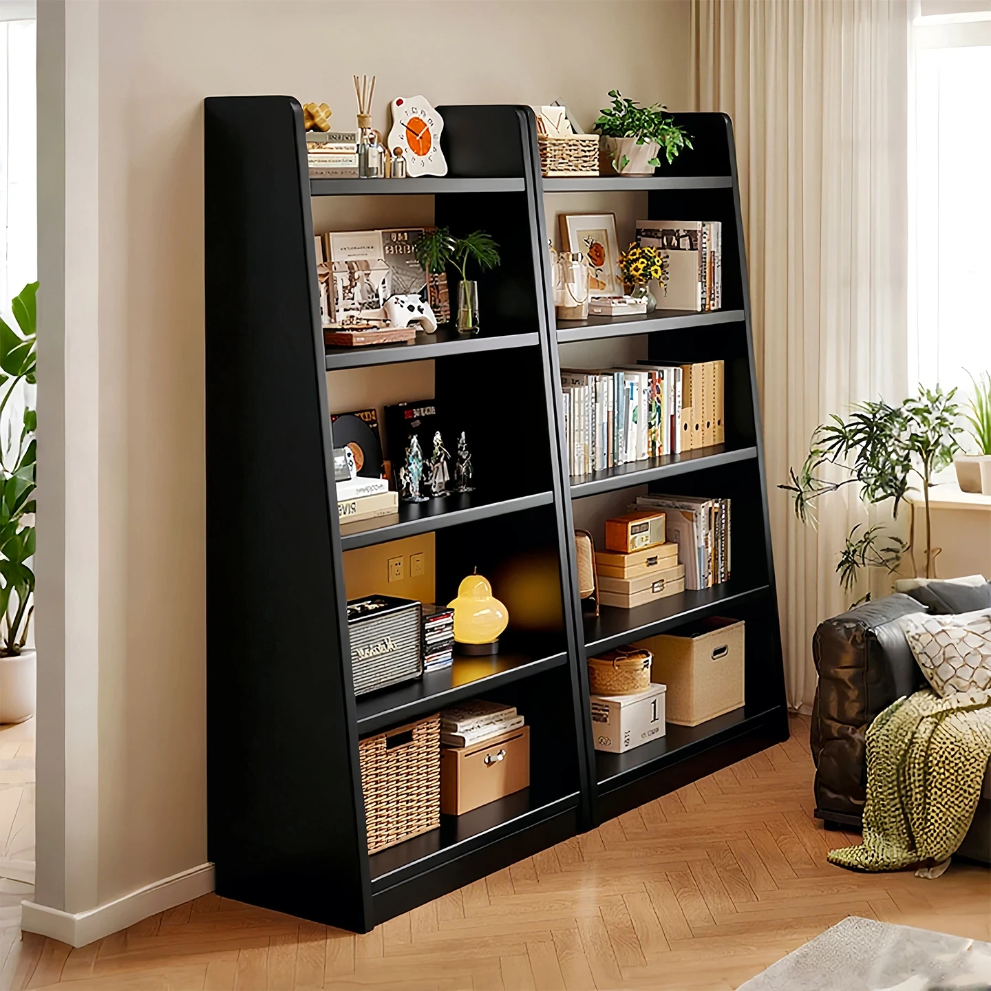 Stylish Black Space-Saving Ladder Bookshelf - Versatile Floor Storage Rack for Living Room, Perfect for Wall-Mounted Bookcase Combinations and Organizing Tools.